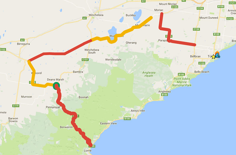 Section 6 – Deans Marsh – Lorne Rd to Neade St Lorne is closed from 9.00am – 13.00pm. Due to the safety concerns of both cyclists and vehicles, access will not be allowed during these times unless an emergency arises.
